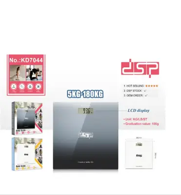 DSP брэндийн KD7044 загварын жин хэмжигч нь биеийн жингээ үнэн зөв, хурдан, найдвартай хэмжих зориулалттай дижитал жин хэмжигч. Орчин үеийн минимал хийцтэй, бат бөх шилэн гадаргуутай тул гал тогоо, унтлагын өрөө, угаалгын өрөө зэрэг аль ч орчинд байршуулж болно. Жингээ тогтмол хянадаг, эрүүл амьдралын хэв маягтай хүмүүст илүү тохиромжтой. Гулсахаас хамгаалсан резинэн тулгууртай. Автоматаар асаж, унтрах функцтэй тул ашиглаагүй үед зай, батарей хэмнэнэ. Даац хэтэрвэл дохио өгнө. Өндөр нарийвчлалтай хэмждэг.