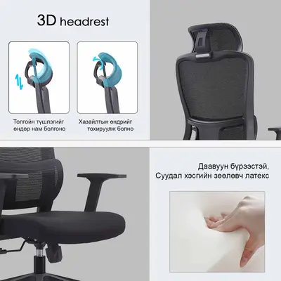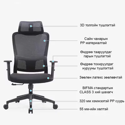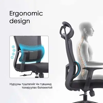 Эргономик дизайтай оффис, ажил, гэрт гээд хаана ч тохирох супер тав тухтай сандал. Удаан суух үед нуруу, хүзүү, гарын ачааллыг бууруулж, зөв суух хэвшил бий болгох олон үйлдэлт эргономик загвартай.