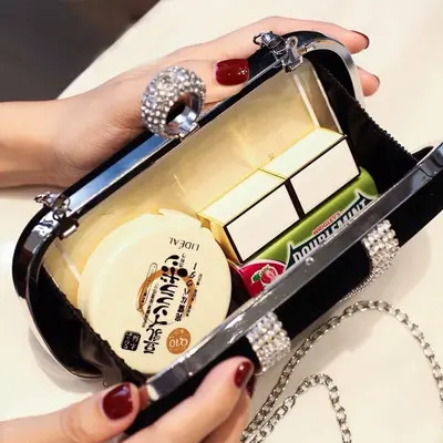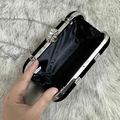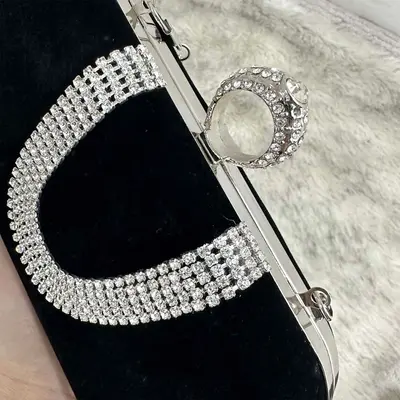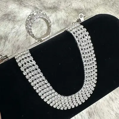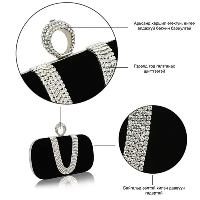 Шинэ жилийн баярын үдэш болон бусад баярын үдэшлэг, эвэнтээр даашинз болон бусад загварын хувцастай төгс тохирох Elegant загварын 2 төрлөөр барих боломжтой гар цүнх. Нэмэлт урт металл оосортой бөгөөд оосоргүйгээр барихад тохиромжтой шигтгээтэй бөгжин загварын бариултай. Нүүр хэсэгтээ үдшийн гэрэлд тод гялтганаж харагдах гоёмсог шигтгээн оруулгатай.