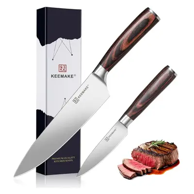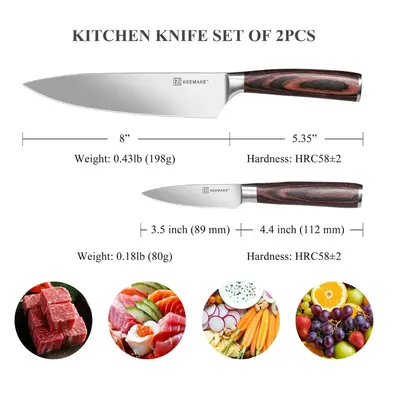 8 инч 2 ширхэг Тогоочийн хутганы модон иштэй сет нь: KEEMAKE брэндийн ахлах тогоочийн хутга нь Германы өндөр нүүрстөрөгчийн гангаар хийгдсэн бөгөөд хурц, бат бөх, тэнцвэртэй хийцтэй.
