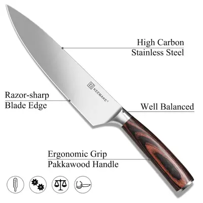 8 инч 3 ширхэг Тогоочийн хутганы модон иштэй сет нь: KEEMAKE брэндийн ахлах тогоочийн хутга нь Германы өндөр нүүрстөрөгчийн гангаар хийгдсэн бөгөөд хурц, бат бөх, тэнцвэртэй хийцтэй.