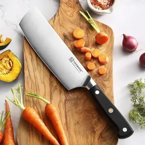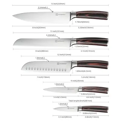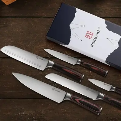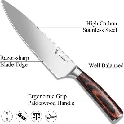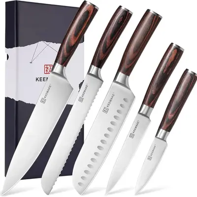 8 инч 5 ширхэг Тогоочийн хутганы модон иштэй сет нь: KEEMAKE брэндийн ахлах тогоочийн хутга нь Германы өндөр нүүрстөрөгчийн гангаар хийгдсэн бөгөөд хурц, бат бөх, тэнцвэртэй хийцтэй.