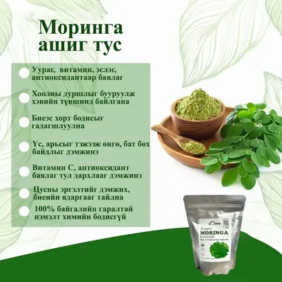 Хэрэглэх заавар: 1/2–1 цайны халбага moringa нунтагыг буцалсан ус, сүү эсвэл тараг жимстэй холин смүүти болгож ууна.