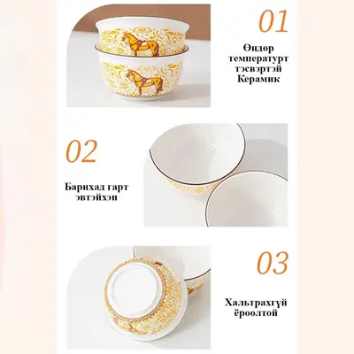 Монгол ахуй, ёс заншлыг шингээсэн керамик аяганы сэт. Өндөр температурт тэсвэртэй сайн чанарын материалтай. Гулсахгүй ёроолтой, барихад гарт эвтэйхэн хэлбэртэй.