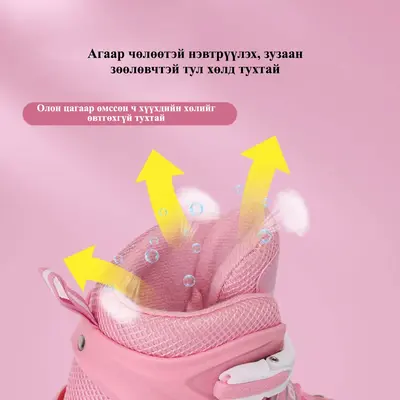 4-12 нас хүртэлх хүүхдийн ролик. Хүүхдийн хөлийг тулгууртай болгох маш сайн бэхэлгээтэй. Удаан хугацаанд өмссөн ч чийг татахгүй, хөл нухаж өвтгөхгүй зузаан зөөлөвчтэй материалтай. Сайн чанарын зузаан үдээстэй, давхар наалттай.