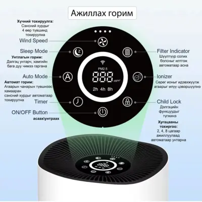 1. Auto Mode (Автомат горим) Төхөөрөмж PM2.5 мэдрэгчээр өрөөний агаарыг тасралтгүй хэмжинэ. Агаарын чанарын түвшнээс хамааран сэнсний хурдыг өөрөө тохируулдаг. Агаар цэвэр үед сэнс удаан эргэж, дуу багатай ажиллана. Агаар бохир үед сэнс хүчтэй ажиллаж, цэвэршүүлэх хурд нэмэгдэнэ. \Эрчим хүч хэмнэдэг тул өдөр тутмын хамгийн тохиромжтой горим.\